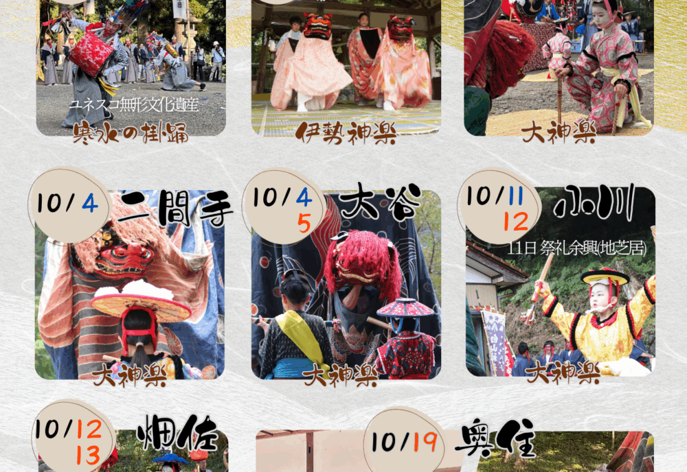 白山信仰が根付く郡上市明宝地域では、秋の白山神社祭礼が行われ、神楽などを奉納します。中でも寒水地区の祭礼で奉納される寒水の掛踊(かのみずのかけおどり)は約300年踊り継がれています。また、名馬 磨墨(するすみ)伝説、気良歌舞伎など、今に伝えられる行事や文化などをご紹介いたします。